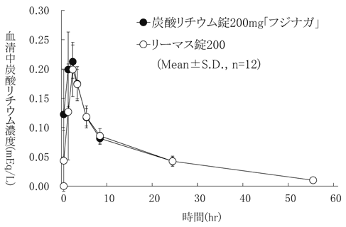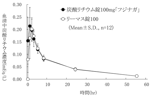 健康成人男性12名に炭酸リチウム錠100mg「フジナガ」2錠とリーマス錠100 2錠(炭酸リチウムとして200mg)、炭酸リチウム錠200mg「フジナガ」1錠とリーマス錠200 1錠を2剤2期のクロスオーバー法により絶食単回経口投与してHPLC法にて血漿中未変化体濃度を測定し、得られた薬物動態パラメータ(AUC、Cmax)について90%信頼区間法にて統計解析を行った結果、log(0.80)~log(1.25)の範囲内であり、両剤の生物学的同等性が確認された4)。