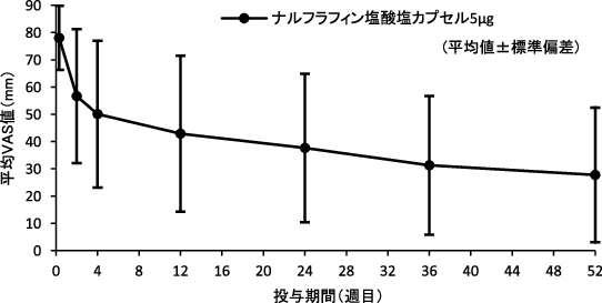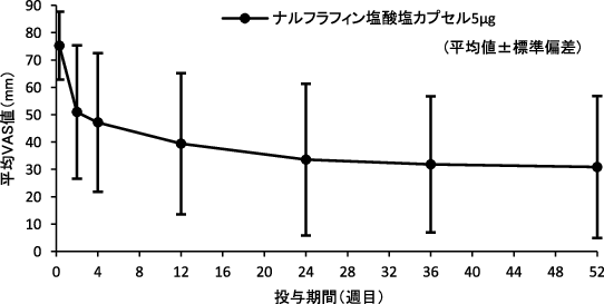 抗ヒスタミン薬又は抗アレルギー薬による治療が奏効しない難治性のそう痒症を有する慢性肝疾患患者※122例を対象に、1日1回、ナルフラフィン塩酸塩5μgを52週間経口反復投与した際の有効性を、VASを用い、オープン試験により検討した。その結果、投与前後でのVAS変化量において有効性が確認された22)。