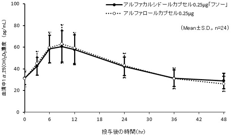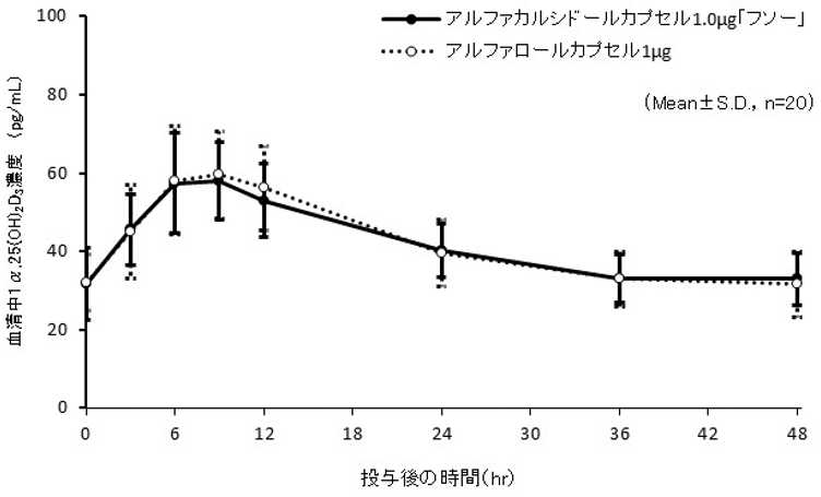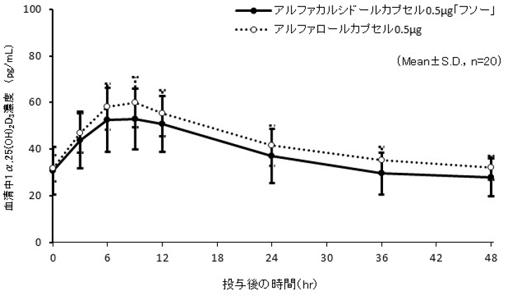 アルファカルシドールカプセル0.25μg「フソー」とアルファロールカプセル0.25μgを、クロスオーバー法によりそれぞれ20カプセル(アルファカルシドールとして5μg注1) )健康成人男子に絶食時単回経口投与して血清中1α,25(OH)2D3濃度を測定し、得られた薬物動態パラメータ(AUC、Cmax)について統計解析を行った結果、両剤の生物学的同等性が確認された2) 。