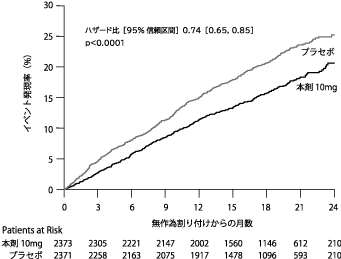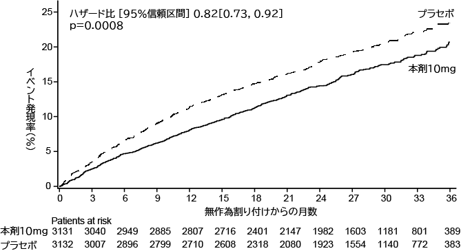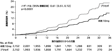 eGFRが25~75mL/min/1.73m2、UACRが200~5000mg/gCr、かつACE阻害薬又はARBを服用している慢性腎臓病患者注18)を無作為割付けした(本剤10mg群2152例(うち日本人128例)、プラセボ群2152例(うち日本人116例))。なお、2型糖尿病合併患者注19)は本剤10mg群1455例(うち日本人67例)、プラセボ群1451例(うち日本人66例)、2型糖尿病非合併患者は本剤10mg群697例(うち日本人61例)、プラセボ群701例(うち日本人50例)であった。本剤10mgを1日1回最長39.2カ月(中央値28.5カ月)間投与したときの複合エンドポイント(eGFRの50%以上の持続的な低下、ESKDへの進展注20)、腎臓死又は心血管死)の初回イベントの発現状況は以下のとおりであった。なお、本剤投与中にeGFRが25mL/min/1.73m2未満に低下した場合も本剤投与を継続可とし、さらに透析が必要となった場合でも本剤投与は継続可とした。