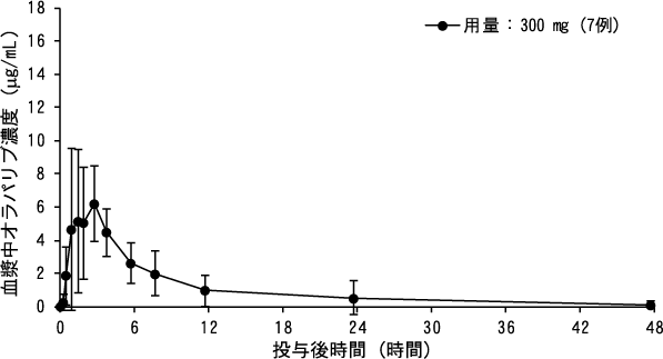 日本人固形癌患者(7例)に本剤300mgを単回経口投与したときのオラパリブの血漿中濃度推移及び薬物動態パラメータは以下のとおりであった2)。