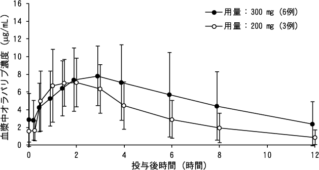 日本人固形癌患者(9例)に本剤200mg注4)及び300mgを1日2回反復経口投与したときの第15日目におけるオラパリブの血漿中濃度推移及び薬物動態パラメータは以下のとおりであった。また、300mg投与時におけるAUC(0-12時間)の累積係数は約1.8であった2)。