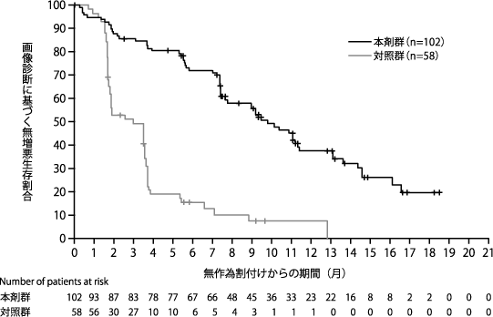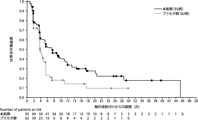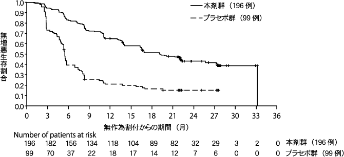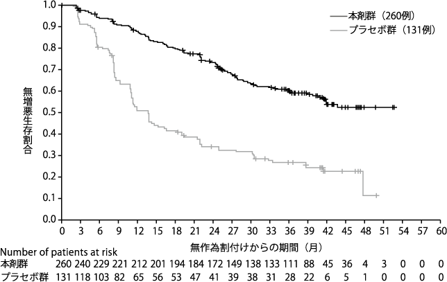 生殖細胞系列のBRCA遺伝子変異陽性(病的変異又は病的変異疑い)で、白金系抗悪性腫瘍剤を含む一次化学療法が16週間以上継続された後、疾患進行が認められていない遠隔転移を有する膵腺癌患者154例(本剤群92例、プラセボ群62例)を対象として、本剤(錠剤)300mg1日2回投与の維持療法における有効性及び安全性をプラセボと比較する無作為化二重盲検プラセボ対照多施設共同第III相試験を実施した。主要評価項目である盲検下での独立中央評価による無増悪生存期間において、本剤はプラセボと比較して統計学的に有意な延長を示した(ハザード比0.53、95%信頼区間0.35~0.82、p=0.0038[両側]、中央値:本剤群7.4カ月、プラセボ群3.8カ月)。(2019年1月15日データカットオフ)