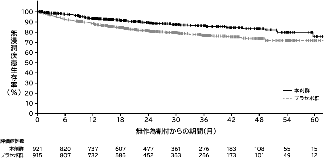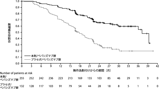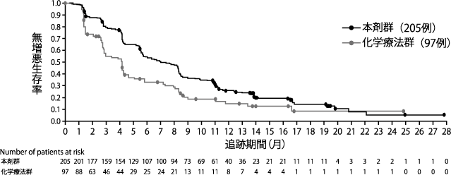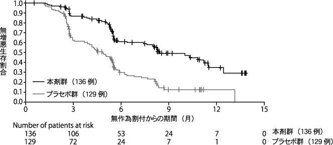 *pMMRの患者集団及びミスマッチ修復機能欠損(dMMR)の患者集団における無増悪生存期間はそれぞれ下表のとおりであった。