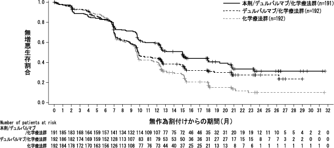 *主要評価項目である治験担当医師判定による無増悪生存期間において、本剤/デュルバルマブ/化学療法群及びデュルバルマブ/化学療法群は化学療法群に対して統計学的に有意な延長を示した(①化学療法群に対する本剤/デュルバルマブ/化学療法群のハザード比0.55、95%信頼区間0.43~0.69、p<0.0001[両側]、中央値:本剤/デュルバルマブ/化学療法群15.1カ月、化学療法群9.6カ月、②化学療法群に対するデュルバルマブ/化学療法群のハザード比0.71、95%信頼区間0.57~0.89、p=0.003[両側]、中央値:デュルバルマブ/化学療法群10.2カ月、化学療法群9.6カ月)。(2023年4月12日データカットオフ)