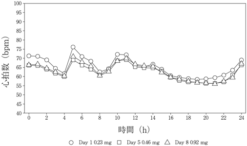 健康成人にオザニモドを1~4日目に0.23mg、5~7日目に0.46mg、8日目以降に0.92mgを1日1回反復経口投与したとき、投与1日目、5日目、8日目の心拍数の推移は以下のとおりであった16)(外国人データ)。,,,,,,,