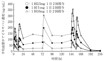 通常、成人にはアピキサバンとして1回10mgを1日2回、7日間経口投与した後、1回5mgを1日2回経口投与する。