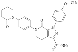 アピキサバンは外因性及び内因性血液凝固経路の収束点である第Xa因子を阻害することにより、その下流のプロトロンビンからトロンビンへの変換を抑制し、直接的な抗血液凝固作用及び間接的な抗血小板作用を示す。