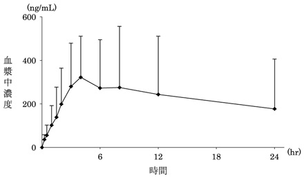 健康成人男性6例を対象として、ペンタサ坐剤1g(メサラジンとして1g含有)を空腹時に単回直腸内投与したとき、血漿中未変化体の濃度推移は図1、血漿中未変化体及び代謝物であるN-アセチルメサラジン(アセチル体)の薬物動態パラメータは表1のとおりであった52)。