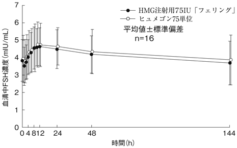 HMG注射用75IU「フェリング」とヒュメゴン75単位を、クロスオーバー法によりそれぞれ75単位を健康成人男子に筋肉内投与して血清中FSH濃度を測定し、得られた薬物動態パラメータ(AUC、Cmax)について統計解析を行った結果、両剤の標準製剤に対する生物学的同等性が確認された2) 。