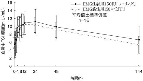 HMG注射用150IU「フェリング」とHMG筋注用150単位「F」を、クロスオーバー法によりそれぞれ150単位を健康成人男子に筋肉内投与して血清中FSH濃度を測定し、得られた薬物動態パラメータ(AUC、Cmax)について統計解析を行った結果、両剤の生物学的同等性が確認された3) 。