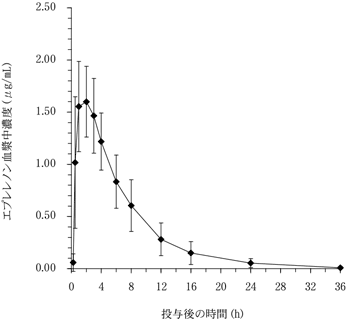 エプレレノンを欧米人健康成人男性に単回経口投与したところ、約1.5時間後に平均最高血漿中濃度(Cmax)に達した。25~100mgまでの用量ではCmax及び血漿中濃度曲線下面積(AUC)はともに用量に比例して増加した1) (外国人データ)。