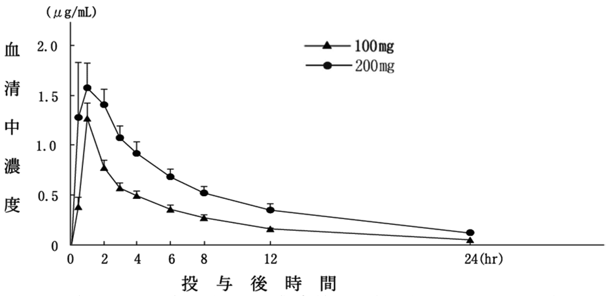 健康成人10例にロメフロキサシンとして100mg及び200mgを空腹時単回経口投与したときの血清中濃度は以下のとおりであった5)。