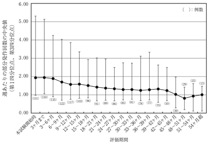 国内第Ⅱ/Ⅲ相試験(成人、併用療法)を完了した患者151例を対象として、レベチラセタム1000~3000mg/日を1日2回に分けて経口投与したときの部分発作回数は以下のとおりであった34),35),36)。本試験に参加した被験者のうち、76例がその後計画された継続試験に移行し本試験を終了した(24~36ヵ月で1例、36~48ヵ月で47例、48ヵ月以降で28例)。