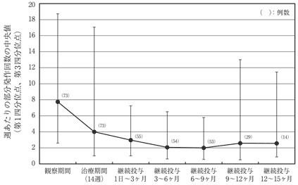既存の抗てんかん薬で十分な発作抑制効果が得られない部分発作を有する4歳以上16歳未満の小児てんかん患者73例を対象として、レベチラセタム40又は60mg/kg/日(体重50kg以上は2000又は3000mg/日)を1日2回に分けて14週間経口投与(既存の抗てんかん薬との併用)したとき、主要評価項目である観察期間からの週あたりの部分発作回数減少率の中央値(95%信頼区間)は、43.21%(26.19%,52.14%)であり、発作頻度の減少が認められた。また、小児てんかん患者55例に14週以降もレベチラセタム20~60mg/kg/日(体重50kg以上は1000~3000mg/日)を1日2回に分けて継続投与したときの部分発作回数は以下のとおりであった37)。
