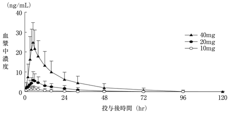 副作用発現頻度は、20mg群で75.0%(99/132例)及び40mg群で82.8%(111/134例)であった。主な副作用は、20mg群では傾眠41.7%(55/132例)、浮動性めまい18.2%(24/132例)、悪心18.9%(25/132例)及び頭痛11.4%(15/132例)、40mg群では傾眠38.8%(52/134例)、浮動性めまい30.6%(41/134例)、悪心21.6%(29/134例)、頭痛15.7%(21/134例)、便秘15.7%(21/134例)及び倦怠感10.4%(14/134例)であった。