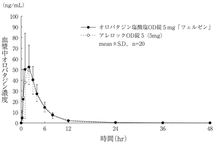 3) 社内資料:生物学的同等性試験(オロパタジン塩酸塩OD錠5mg「フェルゼン」)