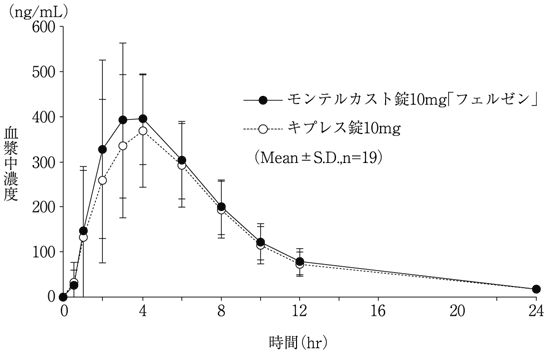 健康成人男性にモンテルカスト錠10mg「フェルゼン」とキプレス錠10mgのそれぞれ1錠(モンテルカストとして10mg)を、絶食時単回経口投与して血漿中モンテルカスト未変化体濃度を測定し、得られた薬物動態パラメータ(AUC、Cmax)について90%信頼区間法にて統計解析を行った結果、log(0.80)~log(1.25)の範囲内であり、両剤の生物学的同等性が確認された(クロスオーバー法)4)。
