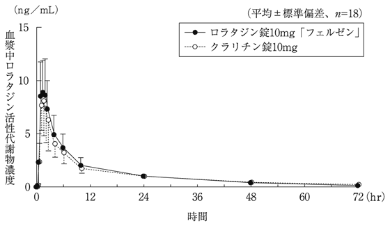 ロラタジン錠10mg「フェルゼン」とクラリチン錠10mgを、クロスオーバー法によりそれぞれ1錠(ロラタジンとして10mg)健康成人男性に絶食単回経口投与して血漿中ロラタジン活性代謝物濃度を測定し、得られた薬物動態パラメータ(AUC、Cmax)について90%信頼区間法にて統計解析を行った結果、log(0.80)~log(1.25)の範囲内であり、両剤の生物学的同等性が確認された3) 。