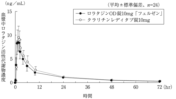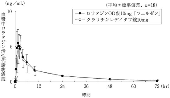 ロラタジンOD錠10mg「フェルゼン」とクラリチンレディタブ錠10mgを、クロスオーバー法によりそれぞれ1錠(ロラタジンとして10mg)健康成人男性に絶食単回経口投与(水で服用及び水なしで服用)して血漿中ロラタジン活性代謝物濃度を測定し、得られた薬物動態パラメータ(AUC、Cmax)について90%信頼区間法にて統計解析を行った結果、log(0.80)~log(1.25)の範囲内であり、両剤の生物学的同等性が確認された3) 。