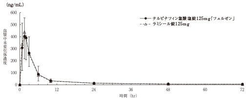 テルビナフィン塩酸塩錠125mg「フェルゼン」とラミシール錠125mgを、クロスオーバー法によりそれぞれ1錠(テルビナフィンとして125mg)健康成人男子に絶食時単回経口投与して血漿中テルビナフィン塩酸塩濃度を測定し、得られた薬物動態パラメータ(AUC、Cmax)について90%信頼区間法にて統計解析を行った結果、log(0.80)~log(1.25)の範囲内であり、両剤の生物学的同等性が確認された3)。