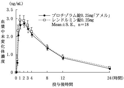 ブロチゾラム錠0.25mg「アメル」とレンドルミン錠0.25mgを、クロスオーバー法によりそれぞれ1錠(ブロチゾラムとして0.25mg)健康成人男子に絶食単回経口投与して血漿中未変化体濃度を測定し、得られた薬物動態パラメータ(AUC、Cmax)について統計解析を行った結果、両剤の生物学的同等性が確認された3)。