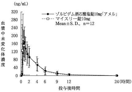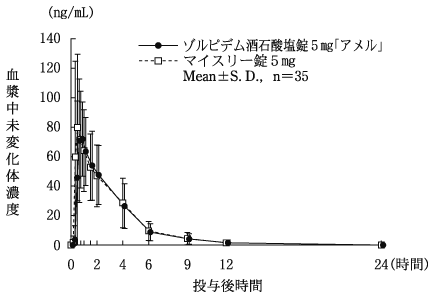 ゾルピデム酒石酸塩錠5mg「アメル」及びゾルピデム酒石酸塩錠10mg「アメル」と各標準製剤について、下記のとおりクロスオーバー法により健康成人男子に絶食単回経口投与して血漿中未変化体濃度を測定し、得られた薬物動態パラメータ(AUC、Cmax)について90%信頼区間法にて統計解析を行った結果、log(0.80)~log(1.25)の範囲内であり、両剤の生物学的同等性が確認された2),3)。