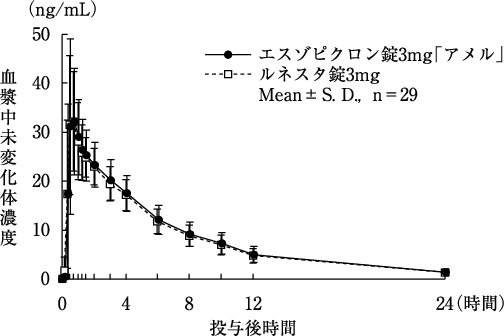エスゾピクロン錠2mg「アメル」及びエスゾピクロン錠3mg「アメル」と各標準製剤について、下記のとおりクロスオーバー法により健康成人男子に絶食単回経口投与して血漿中未変化体濃度を測定し、得られた薬物動態パラメータ(AUC、Cmax)について90%信頼区間法にて統計解析を行った結果、log(0.80)~log(1.25)の範囲内であり、両剤の生物学的同等性が確認された2)。