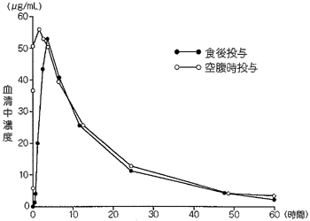 健康成人8例にバルプロ酸ナトリウム錠600mg(200mgを1回3錠)を空腹時及び食後に単回経口投与したとき、空腹時投与と比べて食後投与では吸収速度定数及びCmaxの有意な低下、Tmaxの有意な延長が認められた10)。