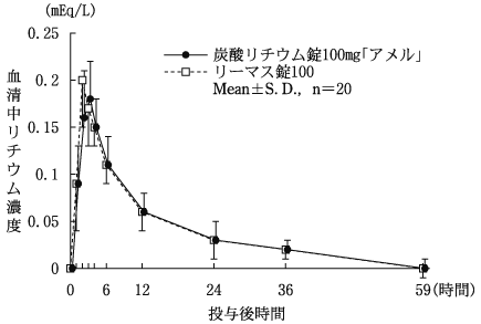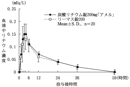 炭酸リチウム錠100mg「アメル」及び炭酸リチウム錠200mg「アメル」と各標準製剤について、下記のとおりクロスオーバー法により健康成人男子に絶食単回経口投与して血清中リチウム濃度を測定し、得られた薬物動態パラメータ(AUC、Cmax)について90%信頼区間法にて統計解析を行った結果、log(0.80)~log(1.25)の範囲内であり、両剤の生物学的同等性が確認された3)。