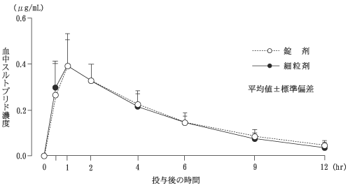 健康成人(12名)に経口投与したときの消化管吸収は速やかで、投与後1.0~1.1時間で最高血中濃度(0.4μg/mL)に達した2)。また、健康成人(6名)に経口投与したときの半減期は約3.0時間であった3)。健康成人(12名)に錠剤又は細粒剤50mgを経口投与したときの血中スルトプリド濃度(スルトプリド塩酸塩に換算)の推移2)