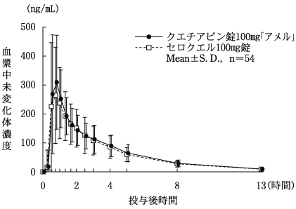 クエチアピン錠12.5mg「アメル」、クエチアピン錠50mg「アメル」及びクエチアピン錠200mg「アメル」について、「含量が異なる経口固形製剤の生物学的同等性試験ガイドライン(平成18年11月24日 薬食審査発第1124004号)」に基づき、錠12.5mg「アメル」はクエチアピン錠25mg「アメル」を、錠50mg「アメル」及び錠200mg「アメル」はクエチアピン錠100mg「アメル」をそれぞれ標準製剤としたとき、溶出挙動が同等と判断され、生物学的に同等とみなされた16)。