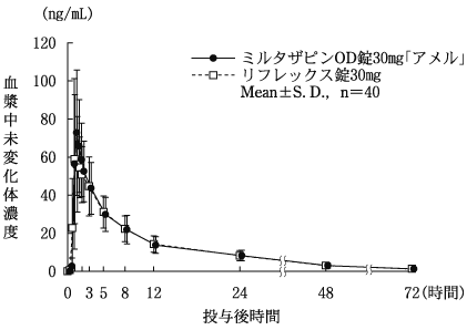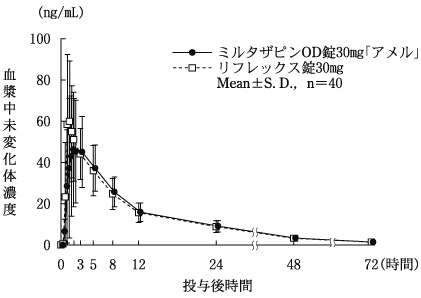 ミルタザピンOD錠15mg「アメル」について、「含量が異なる経口固形製剤の生物学的同等性試験ガイドライン(平成24年2月29日 薬食審査発0229第10号)」に基づき、ミルタザピンOD錠30mg「アメル」を標準製剤としたとき、溶出挙動が同等と判断され、生物学的に同等とみなされた19)。