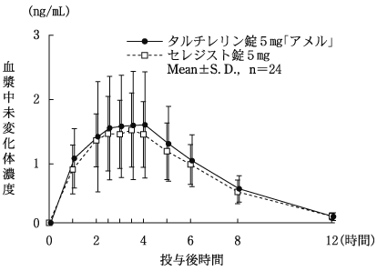 タルチレリン錠5mg「アメル」とセレジスト錠5mgを、クロスオーバー法によりそれぞれ1錠(タルチレリン水和物として5mg)健康成人男子に絶食単回経口投与して血漿中未変化体濃度を測定し、得られた薬物動態パラメータ(AUC、Cmax)について90%信頼区間法にて統計解析を行った結果、log(0.80)〜log(1.25)の範囲内であり、両剤の生物学的同等性が確認された3)。(注)本剤の承認された用法は、食後投与である。