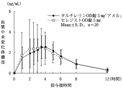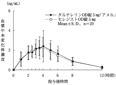 タルチレリンOD錠5mg「アメル」とセレジストOD錠5mgを、クロスオーバー法によりそれぞれ1錠(タルチレリン水和物として5mg)健康成人男子に水なしで絶食単回経口投与して血漿中未変化体濃度を測定し、得られた薬物動態パラメータ(AUC、Cmax)について90%信頼区間法にて統計解析を行った結果、log(0.80)〜log(1.25)の範囲内であり、両剤の生物学的同等性が確認された3)。(注)本剤の承認された用法は、食後投与である。