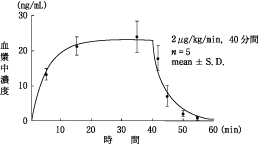 健康成人男子にドブタミン塩酸塩を2μg/kg/minで40分間点滴静注したときの血漿中濃度及び薬物動態パラメータを図1・表1に示す8)。