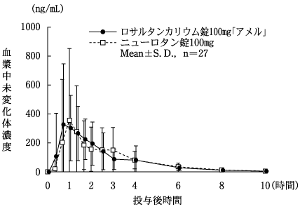 ロサルタンカリウム錠100mg「アメル」とニューロタン錠100mgを、クロスオーバー法によりそれぞれ1錠(ロサルタンカリウムとして100mg)健康成人男子に絶食単回経口投与して血漿中未変化体濃度を測定し、得られた薬物動態パラメータ(AUC、Cmax)について統計解析を行った結果、判定パラメータの対数値の平均値の差がlog(0.90)〜log(1.11)で、かつ、溶出試験で規定するすべての条件で溶出挙動が類似していたことから、両剤の生物学的同等性が確認された7)。