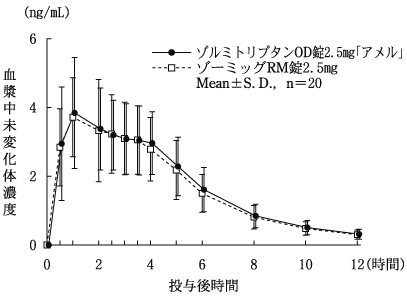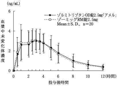 ゾルミトリプタンOD錠2.5mg「アメル」とゾーミッグRM錠2.5mgを、クロスオーバー法によりそれぞれ1錠(ゾルミトリプタンとして2.5mg)健康成人男子に水なし又は水ありで絶食単回経口投与して血漿中未変化体濃度を測定し、得られた薬物動態パラメータ(AUC、Cmax)について90%信頼区間法にて統計解析を行った結果、log(0.80)〜log(1.25)の範囲内であり、両剤の生物学的同等性が確認された8)。