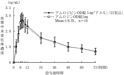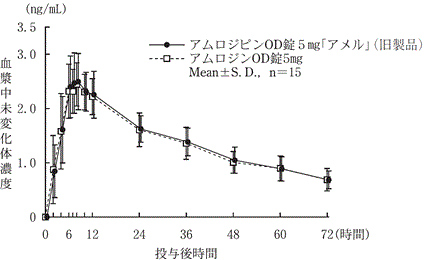 アムロジピンOD錠5mg「アメル」(旧製品)とアムロジンOD錠5mgを、クロスオーバー法によりそれぞれ1錠(アムロジピンとして5mg)健康成人男子に水なし又は水ありで絶食単回経口投与して血漿中未変化体濃度を測定し、得られた薬物動態パラメータ(AUC、Cmax)について90%信頼区間法にて統計解析を行った結果、log(0.80)〜log(1.25)の範囲内であり、両剤の生物学的同等性が確認された8)。