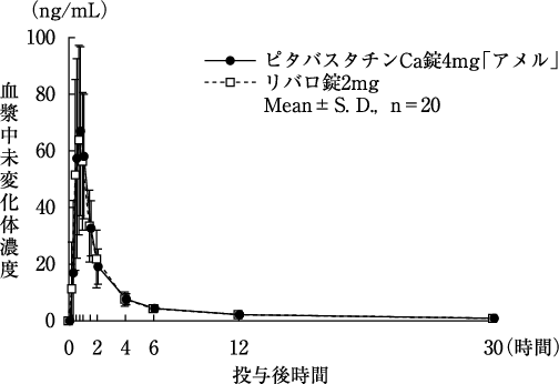 ピタバスタチンCa錠4mg「アメル」1錠、標準製剤2錠(それぞれピタバスタチンカルシウムとして4mg)