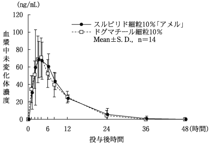 スルピリド細粒10%「アメル」とドグマチール細粒10%を、クロスオーバー法によりそれぞれ0.5g(スルピリドとして50mg)健康成人男子に絶食単回経口投与して血漿中未変化体濃度を測定し、得られた薬物動態パラメータ(AUC、Cmax)について統計解析を行った結果、両剤の生物学的同等性が確認された2)。