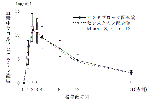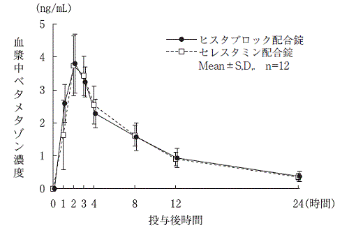 ヒスタブロック配合錠とセレスタミン配合錠を、クロスオーバー法によりそれぞれ2錠(ベタメタゾンとして0.5mg、d-クロルフェニラミンマレイン酸塩として4mg)健康成人男子に絶食単回経口投与してベタメタゾン及びクロルフェニラミンの血漿中未変化体濃度を測定し、得られた薬物動態パラメータ(AUC、Cmax)について統計解析を行った結果、両剤の生物学的同等性が確認された3)。