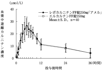 レボカルニチンFF錠250mg「アメル」とエルカルチンFF錠250mgを、クロスオーバー法によりそれぞれ4錠(レボカルニチンとして1000mg)健康成人男子に絶食単回経口投与して血漿中遊離カルニチン濃度を測定し、得られた薬物動態パラメータ(AUC、Cmax)について90%信頼区間法にて統計解析を行った結果、log(0.80)~log(1.25)の範囲内であり、両剤の生物学的同等性が確認された。なお、血漿中遊離カルニチン濃度及び薬物動態パラメータ算出には、投与前の血漿中濃度(内因性遊離カルニチン濃度)を差し引いた値を用いた2)。