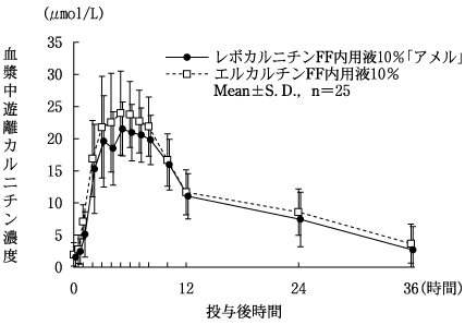 レボカルニチンFF内用液10%「アメル」とエルカルチンFF内用液10%を、クロスオーバー法によりそれぞれ10mL(レボカルニチンとして1000mg)健康成人男子に絶食時単回経口投与して血漿中遊離カルニチン濃度を測定し、得られた薬物動態パラメータ(AUC、Cmax)について90%信頼区間法にて統計解析を行った結果、log(0.80)~log(1.25)の範囲内であり、両剤の生物学的同等性が確認された5)。