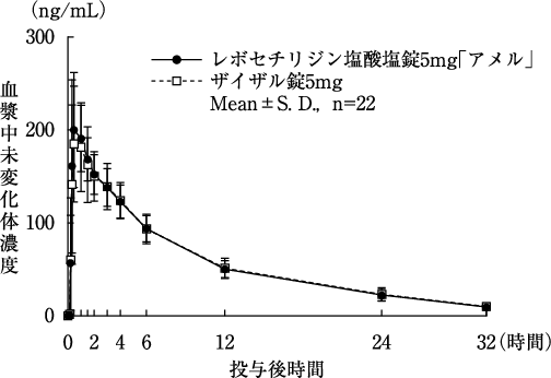 健康成人男性20例にレボセチリジン塩酸塩5mgを空腹時単回経口投与した時、血漿中レボセチリジン濃度は投与後1時間には最高血漿中濃度232.6ng/mLに到達した。血漿中濃度の消失半減期は約7.3時間であった。また、10mgを単回経口投与した時、投与量増量に伴うCmaxの上昇及びAUCの増加が認められた。セチリジン塩酸塩10mgを空腹時単回経口投与した時、血漿中レボセチリジン濃度は投与後1時間には最高血漿中濃度228.3ng/mLに達し、消失半減期は約7.3時間であった1)。レボセチリジン塩酸塩はセチリジン塩酸塩の半量で同様の血漿中レボセチリジン濃度が得られ、血漿中レボセチリジンのCmax及びAUC0-48は同等であった。