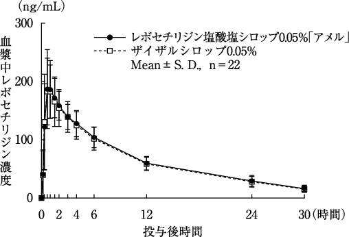 レボセチリジン塩酸塩シロップ0.05%「アメル」とザイザルシロップ0.05%を、クロスオーバー法によりそれぞれ10mL(レボセチリジン塩酸塩として5mg)健康成人男子に絶食単回経口投与して血漿中レボセチリジン濃度を測定し、得られた薬物動態パラメータ(AUC、Cmax)について90%信頼区間法にて統計解析を行った結果、log(0.80)〜log(1.25)の範囲内であり、両剤の生物学的同等性が確認された4)。