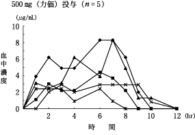 健康成人に、セファレキシン複合顆粒500mg(力価)(n=5)を食後単回経口投与したときの血中濃度及び薬物動態パラメータを図16-1及び表16-1に示す2)。