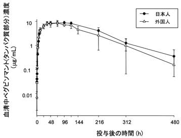 日本人及び外国人の健康成人にペグビソマント1mg(タンパク質部分)/kgを単回皮下投与した場合、血清中薬物動態パラメータ(平均±標準偏差)はそれぞれ、Cmaxが9.01±1.43及び8.98±2.19μg/mL、Tmaxが76及び60時間、AUCが1,910±410及び1,510±550μg・h/mLであり、日本人と外国人で同様の値を示した4),5)(外国人及び日本人データ)。