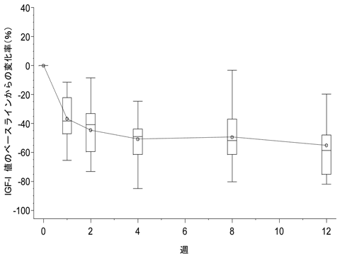 連日投与試験で本剤を投与された被験者のうち医師により安全性及び有効性が問題ないと判断された被験者16例に対し、1日量30mg(タンパク質部分)を上限とする長期投与試験を行った。投与期間の中央値は433.5日(最小値、最大値:92、502)であった。最終観測時点の血清中IGF-Ⅰ値の変化率は、-66.7±31.19%(平均変化率±標準偏差)であり低下を維持した。血清中IGF-Ⅰ値の正常化率は81.3%(13/16例)であった(投与中止例2例を含む)。指輪サイズ及び臨床症状スコア(軟部組織の肥大、関節痛、頭痛、発汗亢進、疲労感)においても引続き改善がみられた。副作用は81.3%(13/16例)に認められた。主な副作用は、注射部位疼痛4例、腹痛3例、頭痛2例、倦怠感2例、高コレステロール血症2例、血清AST増加2例及び眼痛2例であった11)。