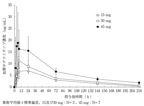 日本人進行固形癌患者計11例に本剤15、30注)及び45mgを1日1回反復投与したときの第1サイクル14日(定常状態時)の血漿中濃度推移と薬物動態パラメータを以下に示す4)。